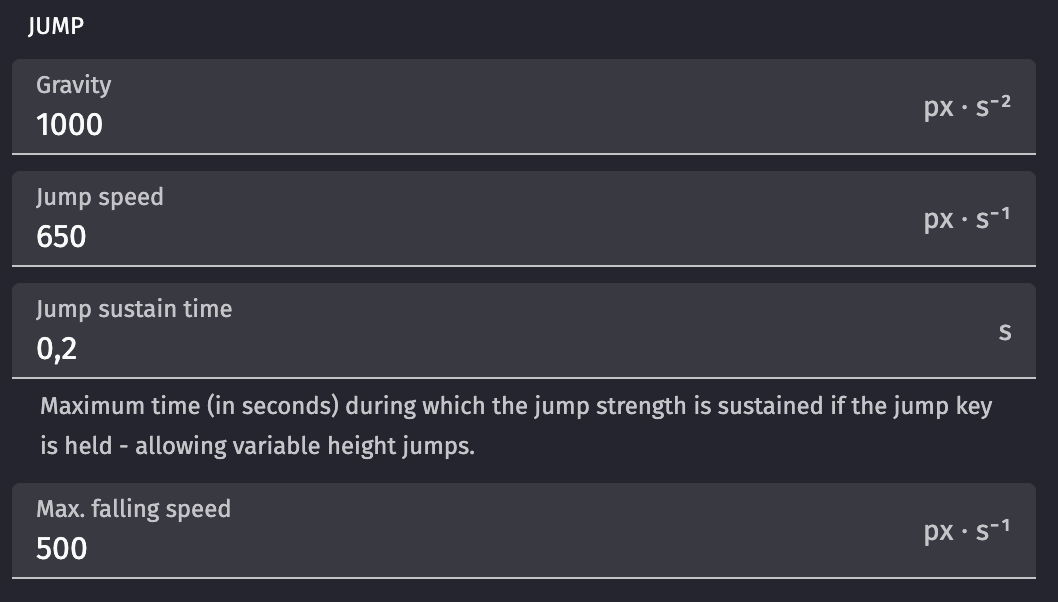 • Max. falling speed to avoid characters going faster and faster because of gravity.